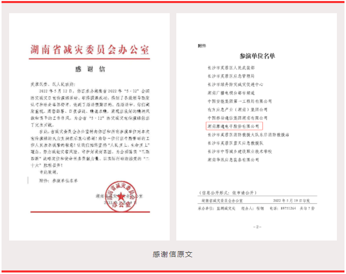 5月19日,康通作為湖南省 2022 年“5·12”全國防災減災日宣傳演練活動的參演單位,收到了來自湖南省減災委員會的感謝信,省減災委員會辦公室對本次演練活動的圓滿成功高度肯定,并對芙蓉區委、區人民政府和所有參演單位在本次宣傳演練的大力支持表示衷心感謝!