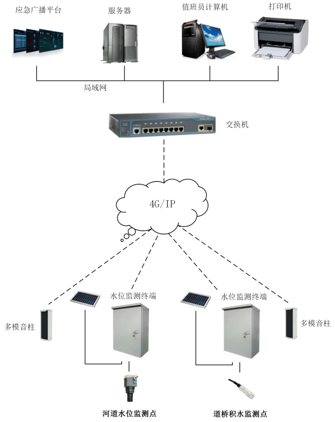 系統采用多級管控,城市防汛聯動系統負責對整個區的內澇點進行全面的監測和管理,當監測終端到達警戒點,城市防汛聯動系統將會把預警信息上傳到應急廣播平臺系統,可實現對相關區域的預警信息播報,以警示來往車輛及周圍居民。