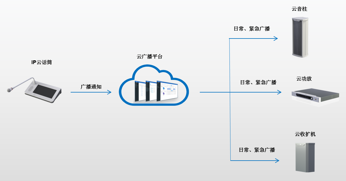 IP云話筒(以下簡稱云話筒)主要部署在廣播室或管理者(如校長、村長等)辦公室,常放置于播控桌或辦公桌上,用戶可以通過一鍵廣播喊話,快速對所管轄或指定的區(qū)域發(fā)布通知、宣傳教育等。也可以外接音源設(shè)備(如手機(jī)音頻線、調(diào)音臺等),提供高品質(zhì)的數(shù)字音頻流采播到指定的區(qū)域播放。該產(chǎn)品采用桌面式設(shè)計(jì),精致美觀,工藝考究,現(xiàn)代感十足;使用7英寸全彩LCD顯示屏,全圖形化界面觸控操作。系統(tǒng)連接如圖所示。