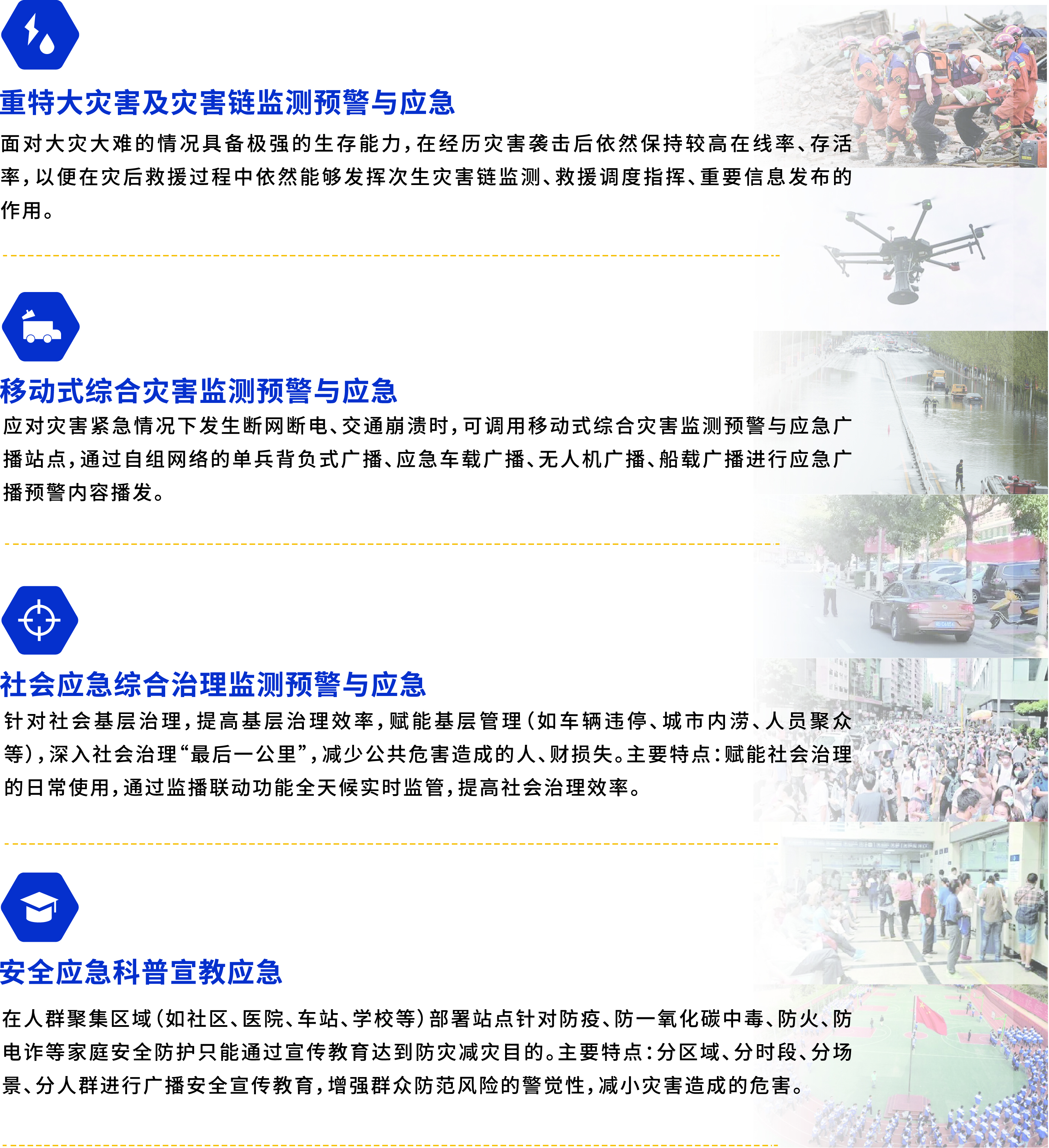 應急救援:應對災害緊急情況下發生斷網斷電、交通崩潰時,可啟用機動應急設備,幫助政府向災區災民將政策快速下達,加快重建進度。主動關懷災區群眾,安撫災區群眾情緒,加強人文關懷。