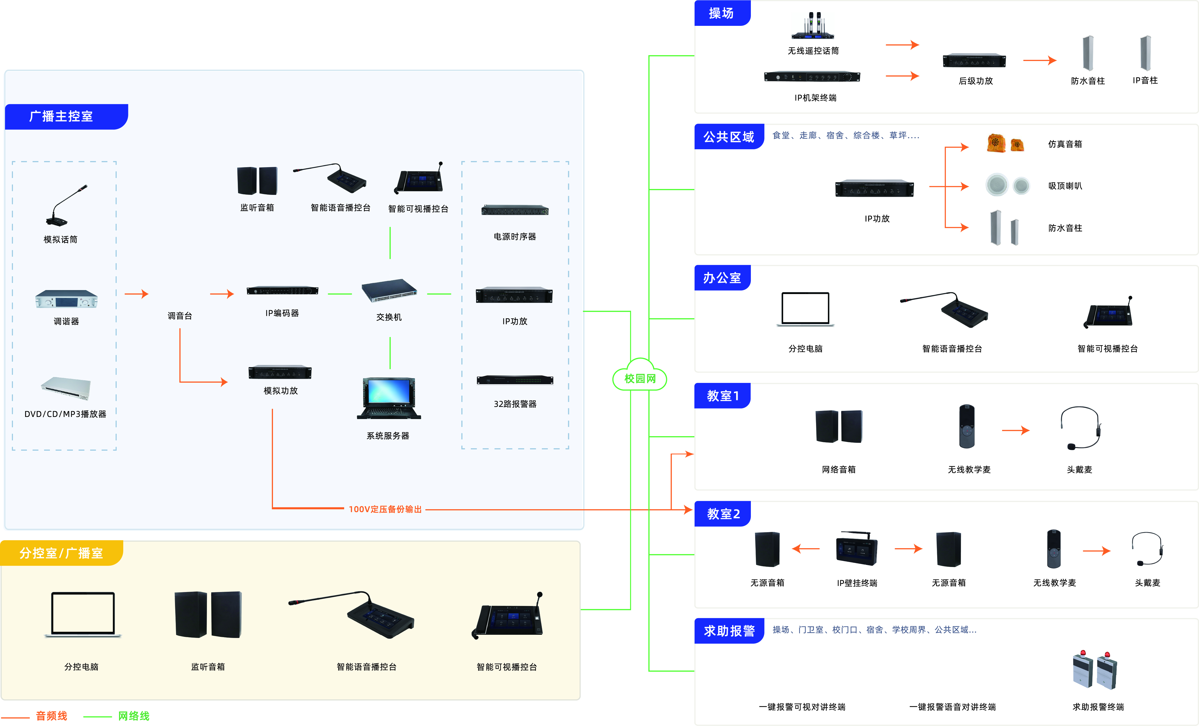 星云IP廣播系統(tǒng)基于信息共享、資源整合、集中管理、服務(wù)良好等原則,全方位實(shí)現(xiàn)校園信息化廣播系統(tǒng)需求。通過星云廣播軟件設(shè)置,既可全校范圍內(nèi)統(tǒng)一集中控制管理,又可各分區(qū)獨(dú)立管理。接入校園網(wǎng)的電腦均可作為校園廣播系統(tǒng)的分控點(diǎn),可在教師辦公室、學(xué)生處、領(lǐng)導(dǎo)辦公室等設(shè)置廣播分控工作站。可對(duì)校園內(nèi)的教學(xué)樓、綜合樓、食堂、宿舍及操場(chǎng)等區(qū)域進(jìn)行分區(qū)管理或統(tǒng)一控制,配套采用不同場(chǎng)景下?lián)P聲器等設(shè)備,可覆蓋整個(gè)教學(xué)功能區(qū)及校園內(nèi)聲場(chǎng),超越傳統(tǒng)的教育模式,實(shí)現(xiàn)無人值守的校園數(shù)字自動(dòng)化廣播功能,提高綜合辦學(xué)質(zhì)量和效益。